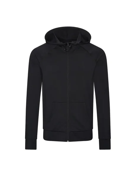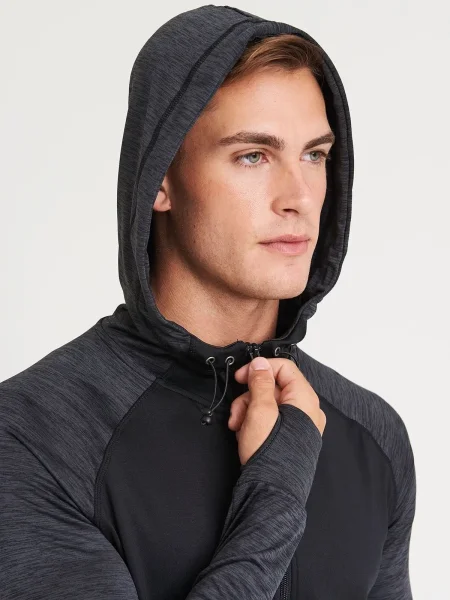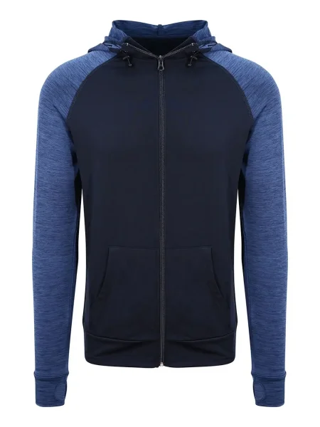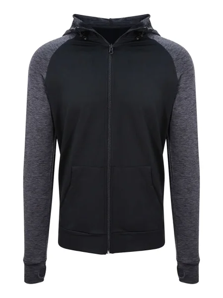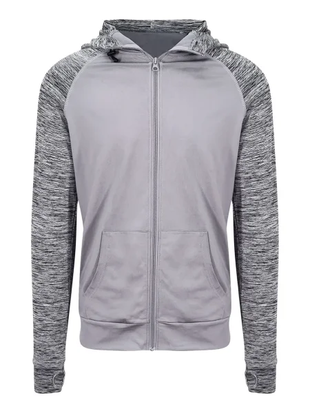 Felpa Men's Cool Contrast Zoodie Just Cool AWDis. Felpa con cappuccio e maniche raglan da uomo, tessuto misto poliestere, maniche melange a contrasto, tessuto traspirante ad asciugatura rapida, cappuccio regolabile, tasca a marsupio, zip intera, fori per i pollici.