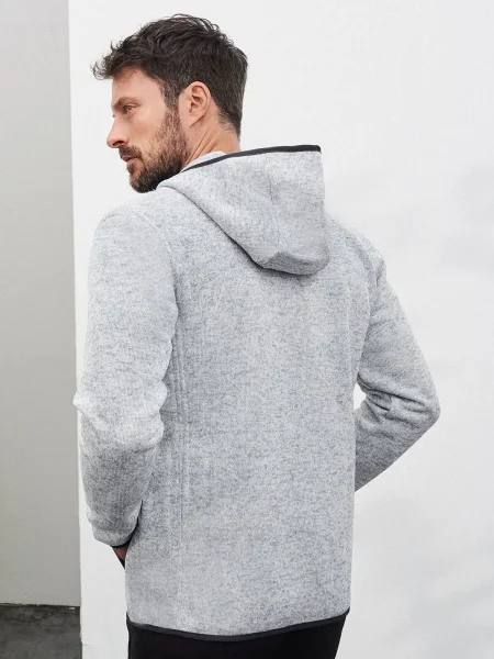 Pile uomo con cappuccio in maglia in pile melange, tessuto morbido, caldo e facile da stirare. All'esterno appare come lavorato a maglia, all'interno soffice e morbido, Sottili cuciture divisorie. Cappuccio, polsini a contrasto, 2 tasche sul davanti,manica lunga, policromo
