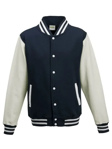 Felpa Varsity Jacket Just Hoods awdis. Felpa con maniche set-in di colore contrastante. Collo, polsini e orlo inferiore in maglia con strisce contrastanti. Nastro di rinforzo al collo, tasche di colore contrastante, struttura con cuciture laterali.