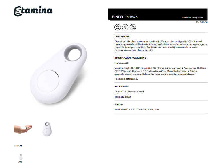 Dispositivo di localizzazione anti-smarrimento. Compatibile con dispositivi iOS e Android tramite app mobile via Bluetooth. Il dispositivo è alimentato a batteria e ha un foro integrato per un facile trasporto e utilizzo. Tra le sue caratteristiche figurano un telecomando, registrazione vocale e allarme acustico.