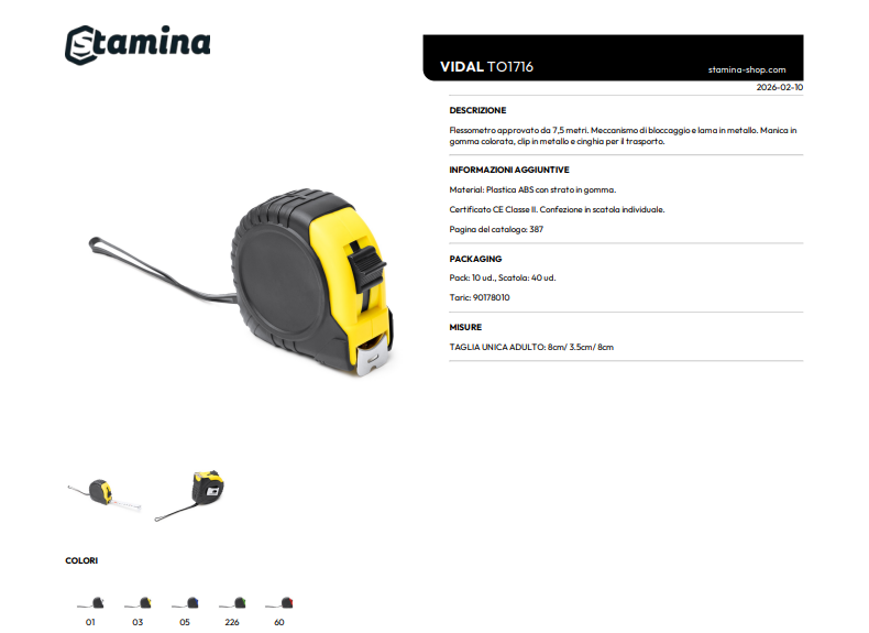 Flessometro approvato da 7,5 metri. Meccanismo di bloccaggio e lama in metallo. Manica in gomma colorata, clip in metallo e cinghia per il trasporto.