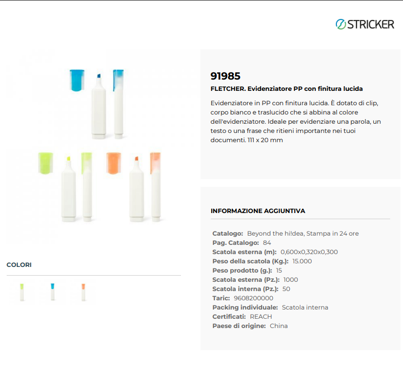 Evidenziatore con clip realizzato in PP con elegante finitura lucida caratterizzato da corpo bianco con dettagli traslucidi abbinati al colore dell’inchiostro pratico e maneggevole ideale per evidenziare parole frasi e parti importanti di documenti libri o appunti perfetto per ufficio scuola e studio dimensioni 111 x 20 mm.