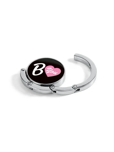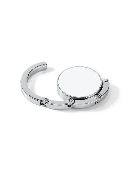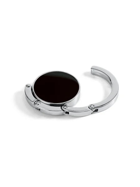 Supporto per borse in metallo. Il supporto può essere appoggiato su una superficie per appendere la borsa. Quando viene piegato rimane chiuso grazie ad una calamita. ø45 x 8 mm