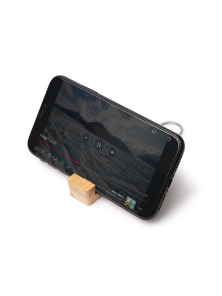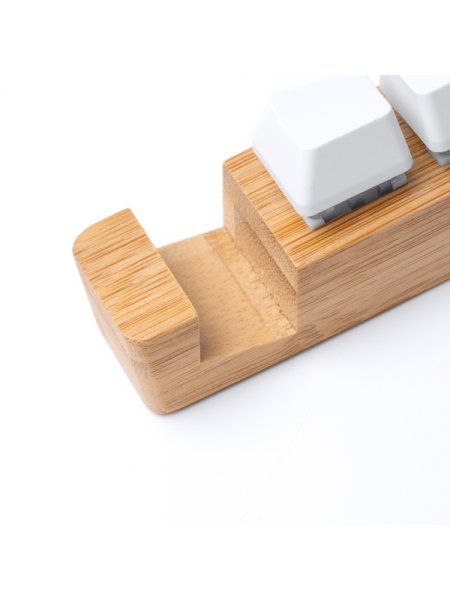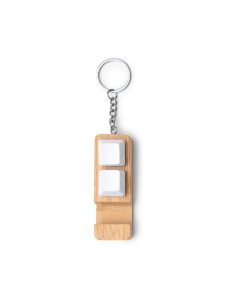 Portachiavi in bambù con supporto per smartphone e funzione antistress. Il design presenta tasti bianchi che possono essere premuti e utilizzati come antistress.