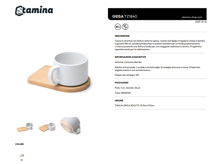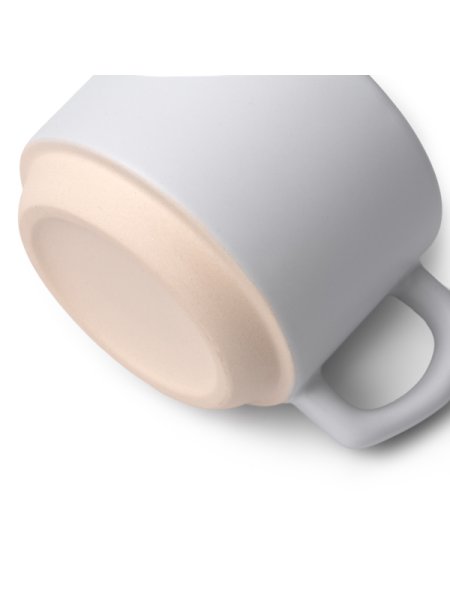 Tazza in ceramica con finitura esterna opaca, manico dal design irregolare e base in bambù. Capacità 180 ml, include sottobicchieri in bambù fustellati per un facile posizionamento. L'interno presenta una finitura lucida per una maggiore resistenza e durata. Progettata appositamente per la sublimazione. Confezione in cartone kraft.