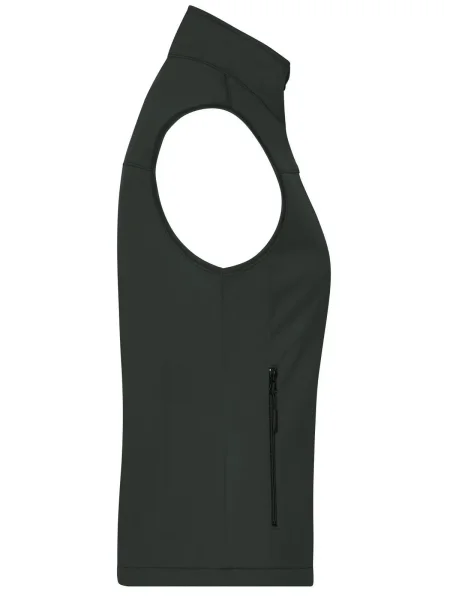Gilet softshell sportivo, a 3 strati con membrana TPU, antivento e idrorepellente (5,000mm colonne), traspirante e permeabile al vapore acqueo, pile interno, rivestimento in mesh sul davanti, colletto alto, 2 tasche laterali e una sul petto con zip YKK, leggermente sciancrata.