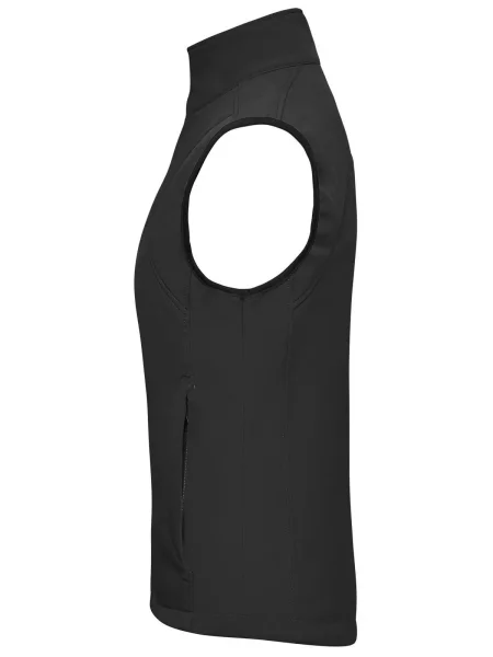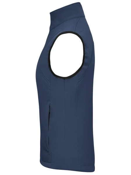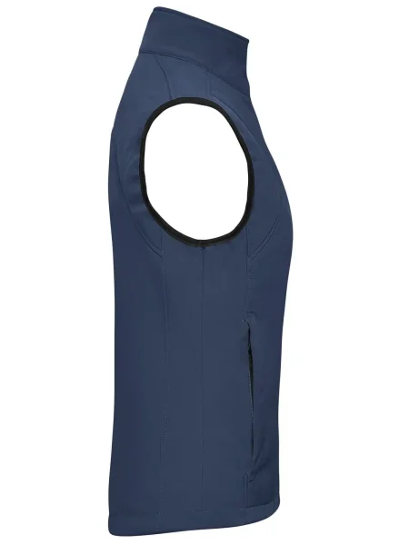 Gilet softshell donna personalizzato, tessuto a membrana a tre strati in TPU, antivento, traspirante e idrorepellente (5.000 mm colonna d'acqua). Le cuciture non sono chiuse, lato interno in microfleece, fodera in rete sul lato anteriore, 2 tasche laterali con cerniera, cordino elastico con stopper in vita, cerniera sulla schiena, leggermente sciancrata. Fodera in fleece, softshell, colonna d'acqua 5.000 mm, antivento e idrofugo.