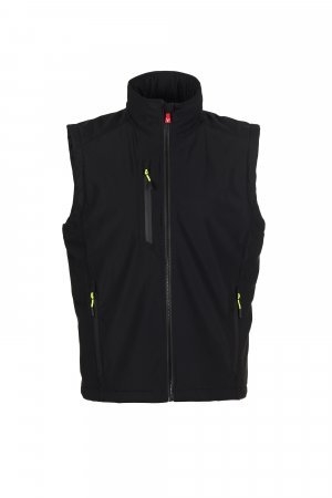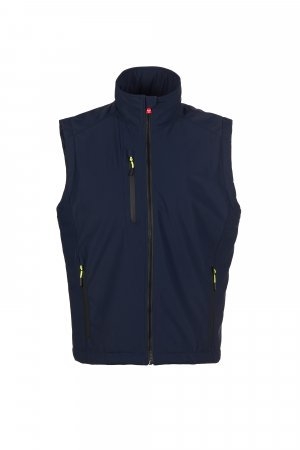 Gilet soft-shell 2 strati, dall'imbottitura leggera (100g/m²), da uomo, chiusura tramite zip SBS con cursore in metallo "semi-auto lock" e tiretto personalizzato. Banda retroriflettente su fondoschiena. Due tasche laterali con zip, una tasca al petto con zip spalmata. Tiretti fluorescenti. Una tasca a filetto interna con chiusura a strappo. Fondo regolabile con stopper personalizzati.