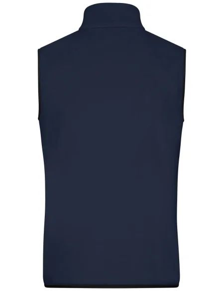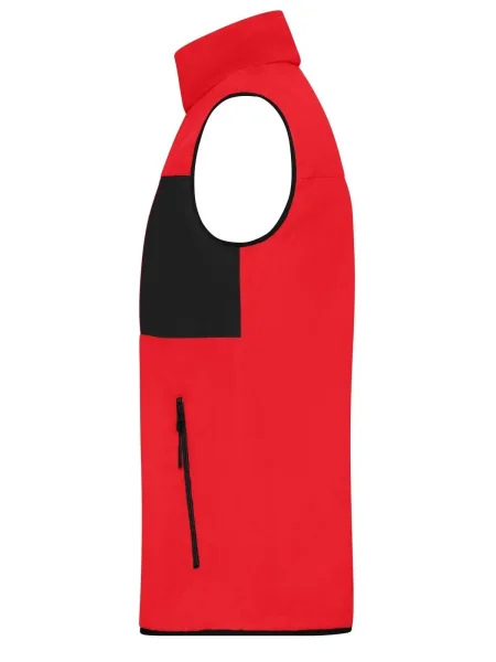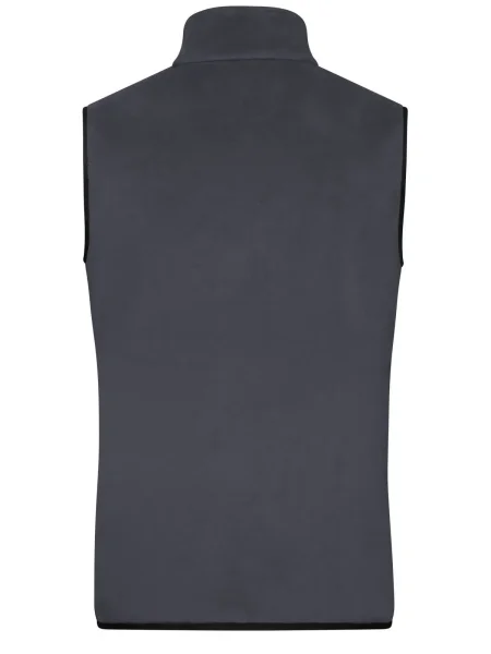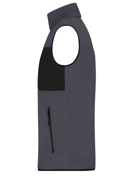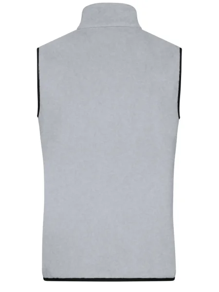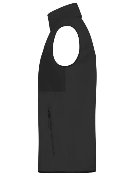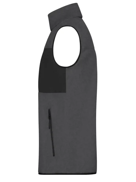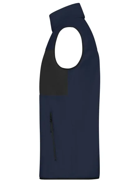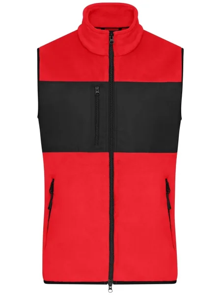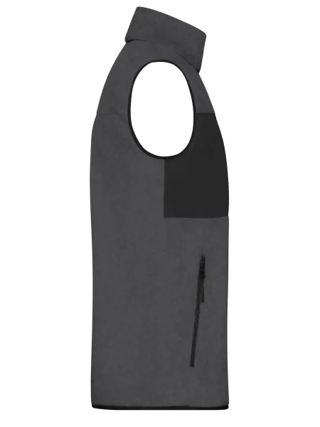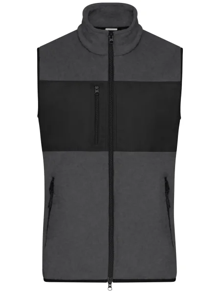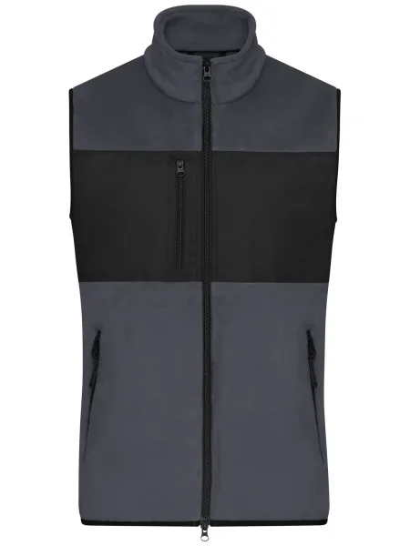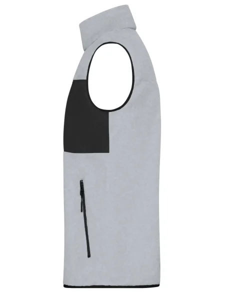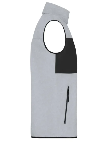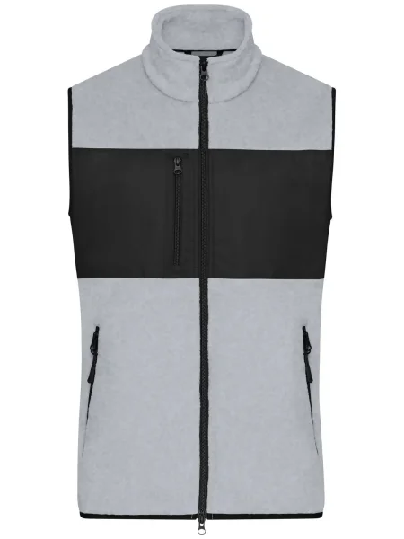 Gilet uomo in pile realizzato in materiale misto con poliestere riciclato, morbido, caldo e di facile manutenzione. Presenta un inserto in tessuto con taschino sul petto, due tasche laterali e una tasca sul petto con chiusura a zip, oltre a due tasche interne. Dotato di zip frontale YKK a doppio cursore e collo alto.