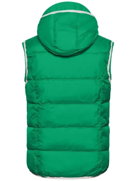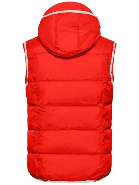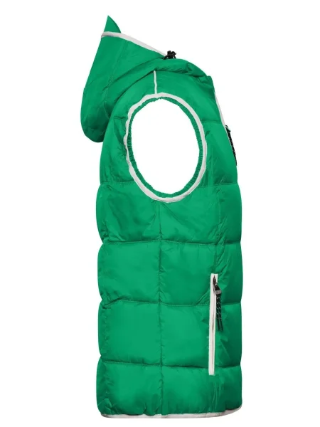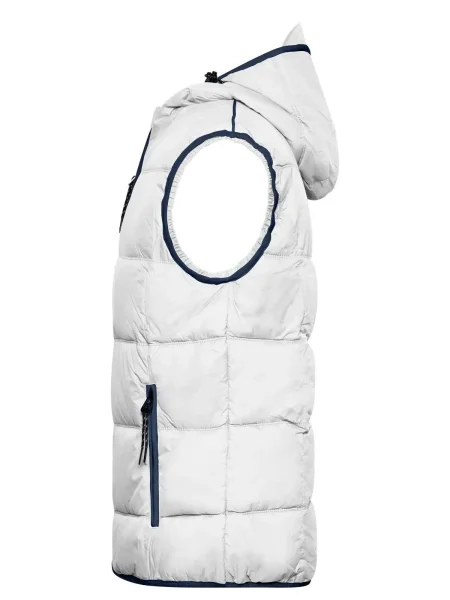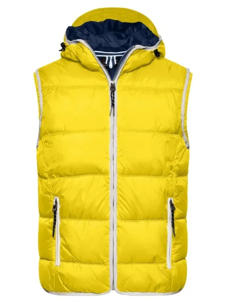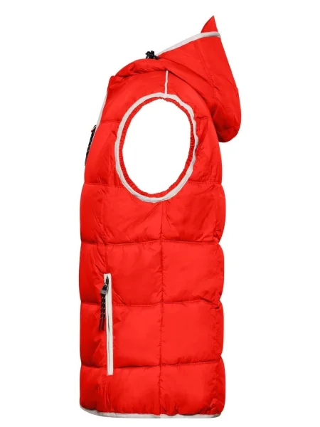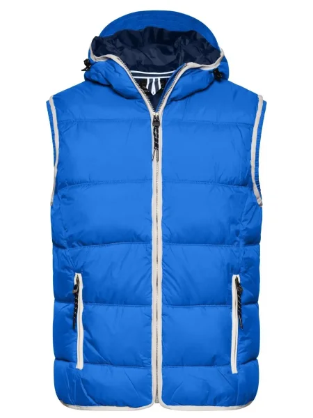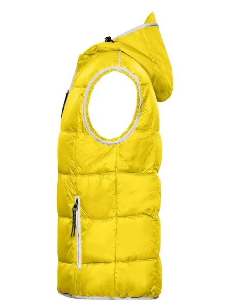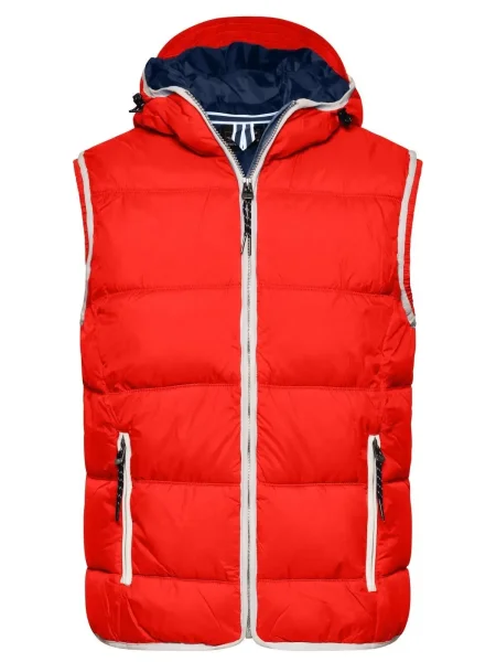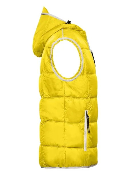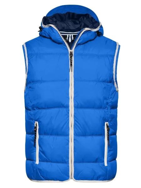 Gilet smanicato, imbottito, superificie opaca con leggero rivestimento in poliuretano, antivento e idrorepellente. Due tasche frontali e un taschino interno, giromanica elastico, cappuccio con cordino elastico e stopper.