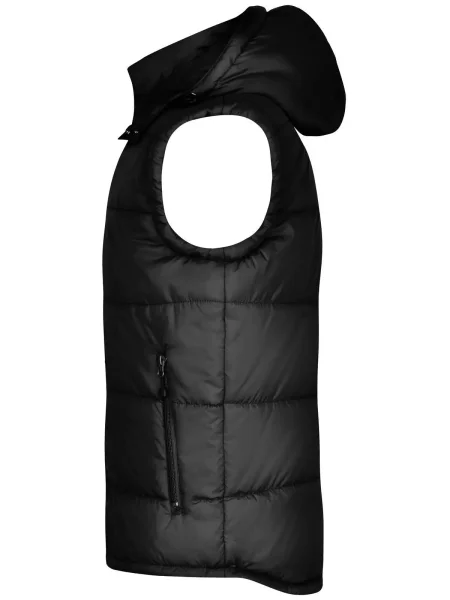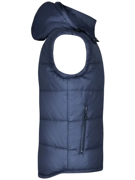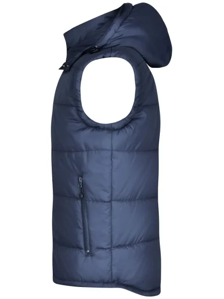 Gilet trapuntato con cappuccio staccabile, superficie opaca con leggero strato in TPU. Idrorepellente e antivento (600 mm colonna d'acqua), 2 tasche anteriori, taschino e tasca interna portacellulare, protezione antivento totale. Cordino elastico con stopper in vita e sul cappuccio, cerniera per ricamo sulla schiena. Fodera: 100% poliestere, Imbottitura: 100% poliestere, trapuntato, imbottito, antivento e idrofugo