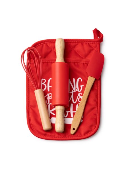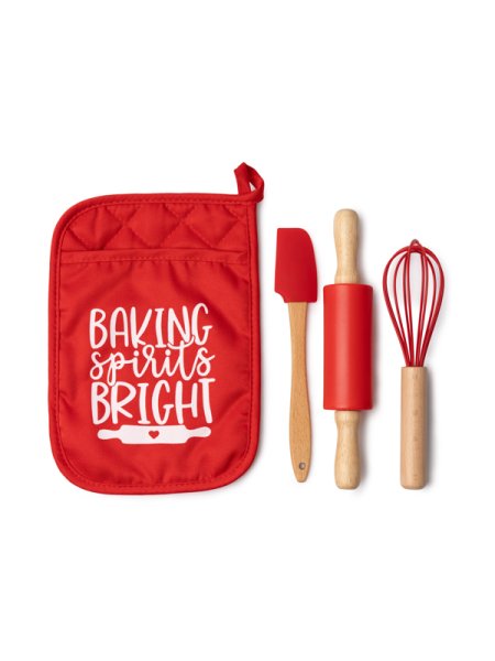 Set da cucina composto da 3 elementi per preparare biscotti fatti in casa. Include mattarello, frusta e spatola con decorazioni natalizie. Include un guanto multiuso per riporre gli utensili.