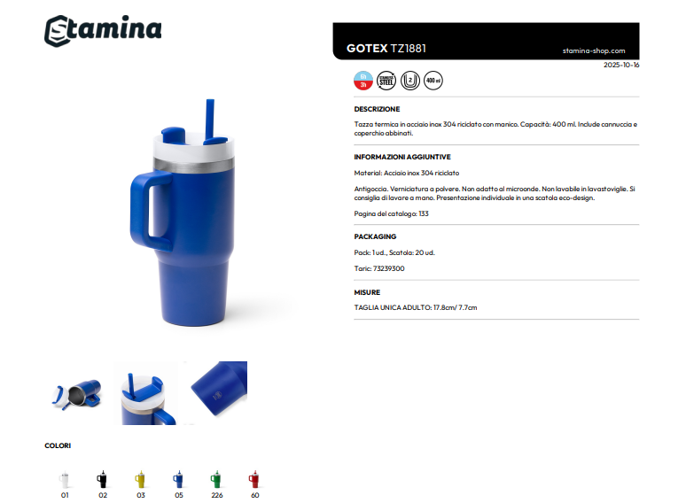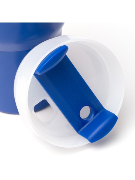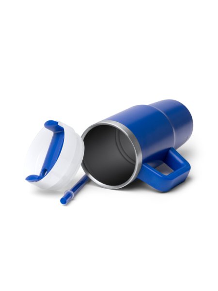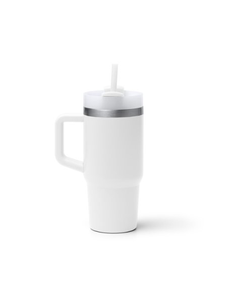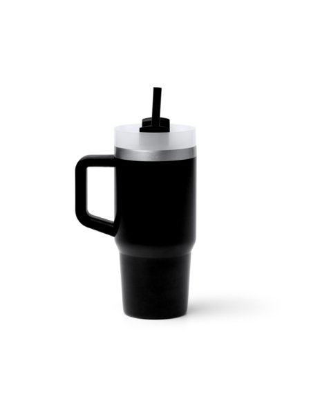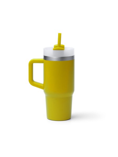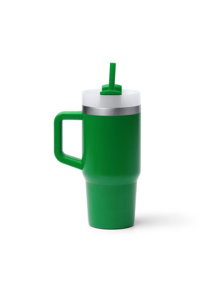 Tazza termica in acciaio inox 304 riciclato con manico. Capacità: 400 ml. Include cannuccia e coperchio abbinati.