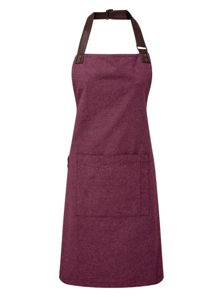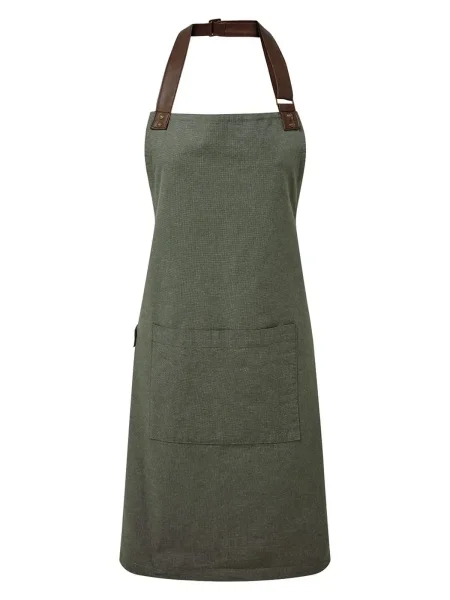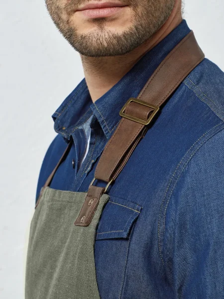 Grembiule con inserti in finta pelle. Girocollo in ecopelle con fibbia regolabile e cuciture a contrasto, asola appendi-grembiule e linguette laterali in ecopelle con cuciture a contrasto, tasca centrale, doppio occhiello per la chiusura in vita.