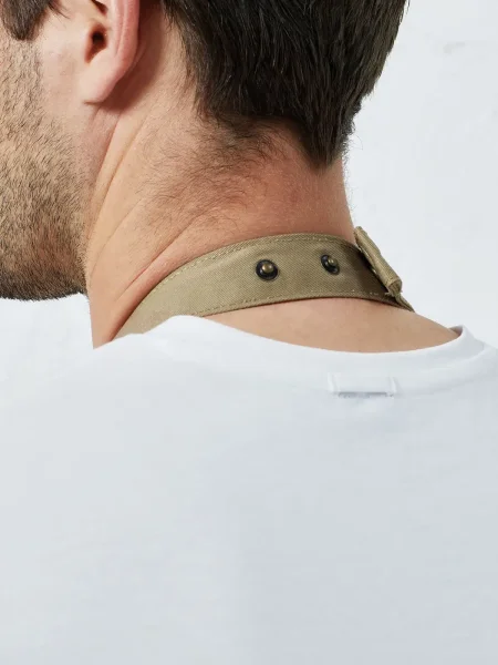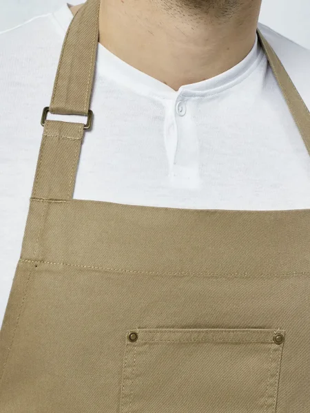 Grembiule con pettorina e grande tasca frontale con rivetti e cuciture, due tasche laterali, cordoncino al collo regolabile e fermabile con bottone a pressione. Lavabile a 60 °C