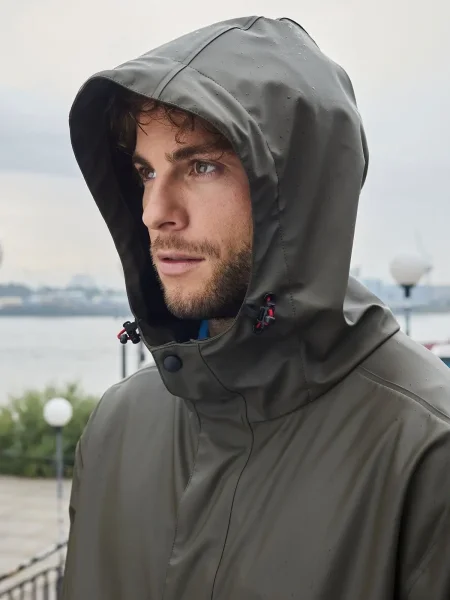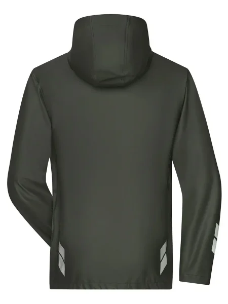 Giacca antipioggia unisex in tessuto antivento e idrorepellente (10,000 colonne d'acqua). Cuciture nastrate, ampio cappuccio regolabile. Fondo regolabile, polsini regolabili con velcro, 2 tasche laterali con bottone automatico. Elementi riflettenti (senza funzione protettiva / senza DPI) sul retro e sulle maniche. Zip YKK.