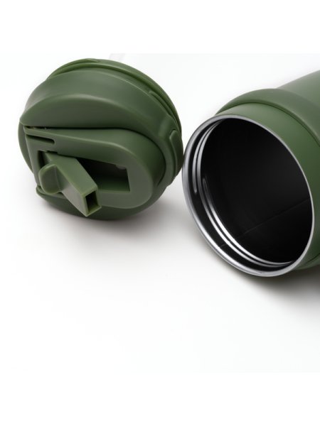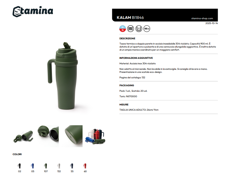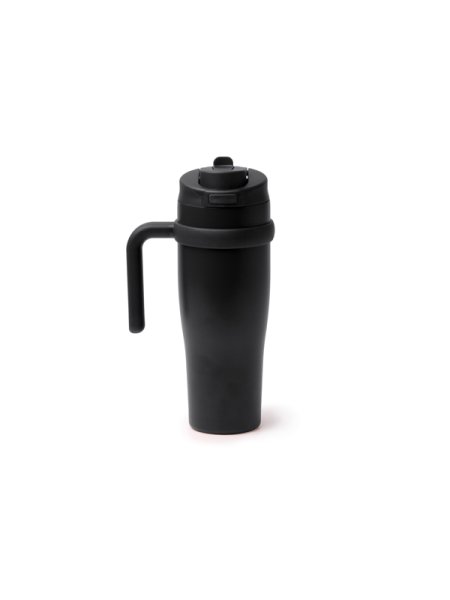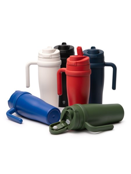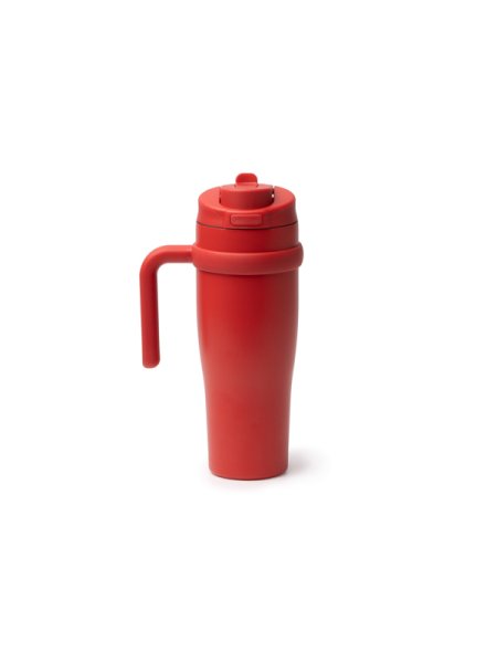 Tazza termica a doppia parete in acciaio inossidabile 304 riciclato. Capacità 900 ml. È dotata di un'apertura a pulsante e di una cannuccia allungabile aggiuntiva. È inoltre dotata di un ampio manico coordinato per un maggiore comfort.