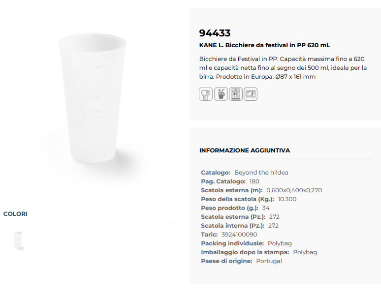 Bicchiere da Festival in PP con una capacità fino a 620 mL, progettato per essere resistente e pratico durante eventi e manifestazioni. Realizzato in Europa, è l'accessorio ideale per festival e occasioni all'aperto. Con dimensioni di Ø87 x 161 mm, è comodo da trasportare e usare. Un bicchiere funzionale per ogni tipo di evento.