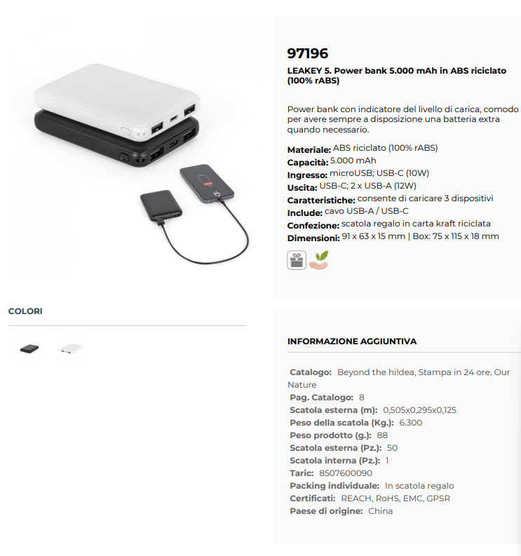 Il power bank 5000 mAh in ABS riciclato è una soluzione pratica e sostenibile per ricaricare i tuoi dispositivi ovunque ti trovi. Realizzato al 100% in rABS, è dotato di indicatore del livello di carica per monitorare facilmente l’energia disponibile. Include una porta USB-C con funzione ingresso e uscita, una porta microUSB per l’ingresso e due porte USB-A per l’uscita, consentendo di caricare più dispositivi contemporaneamente. Fornito con cavo di ricarica USB-C e confezione regalo in carta kraft riciclata, ha dimensioni compatte di 91 x 63 x 15 mm, ideale per uso quotidiano e viaggi.