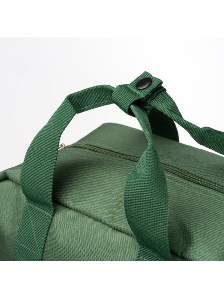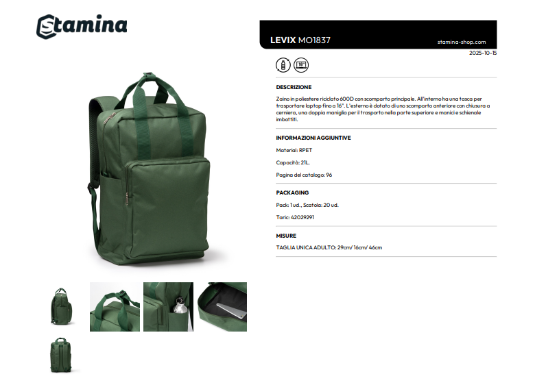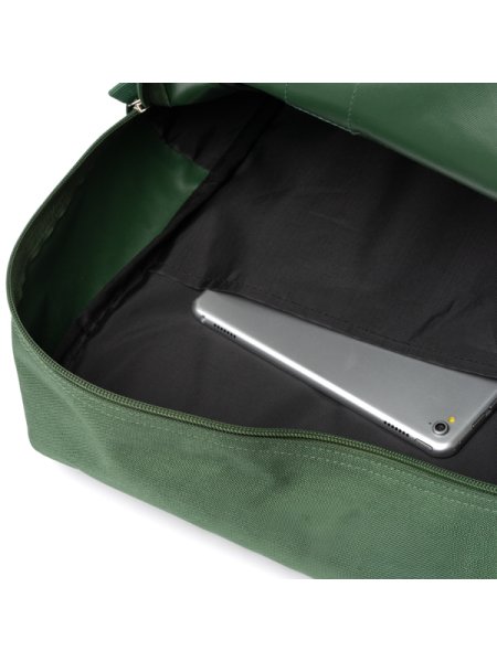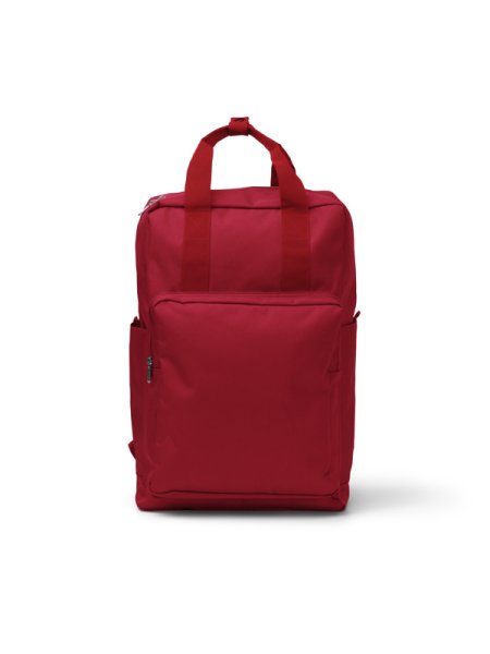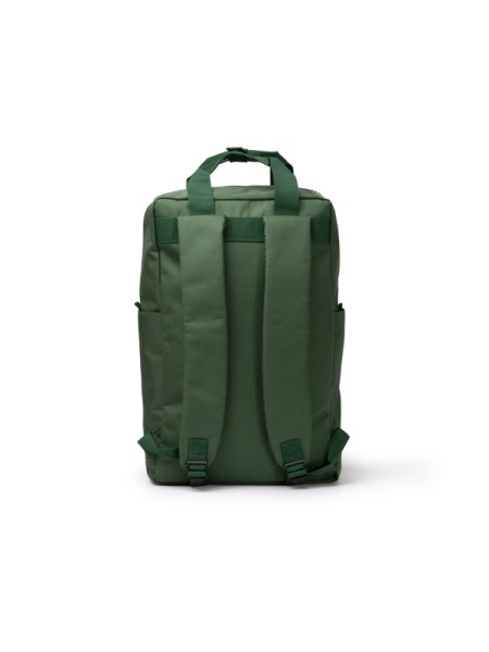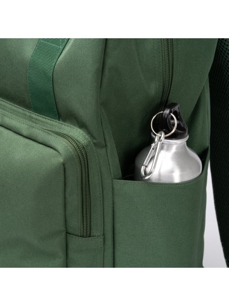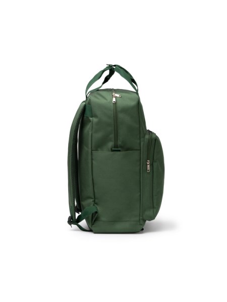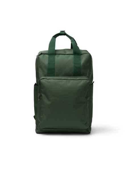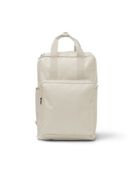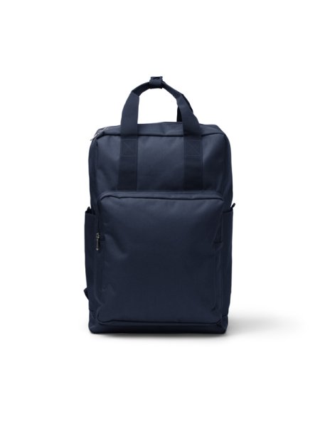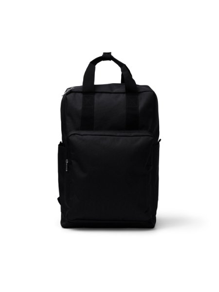 Zaino in poliestere riciclato 600D con scomparto principale. All'interno ha una tasca per trasportare laptop fino a 16". L'esterno è dotato di uno scomparto anteriore con chiusura a cerniera, una doppia maniglia per il trasporto nella parte superiore e manici e schienale imbottiti.