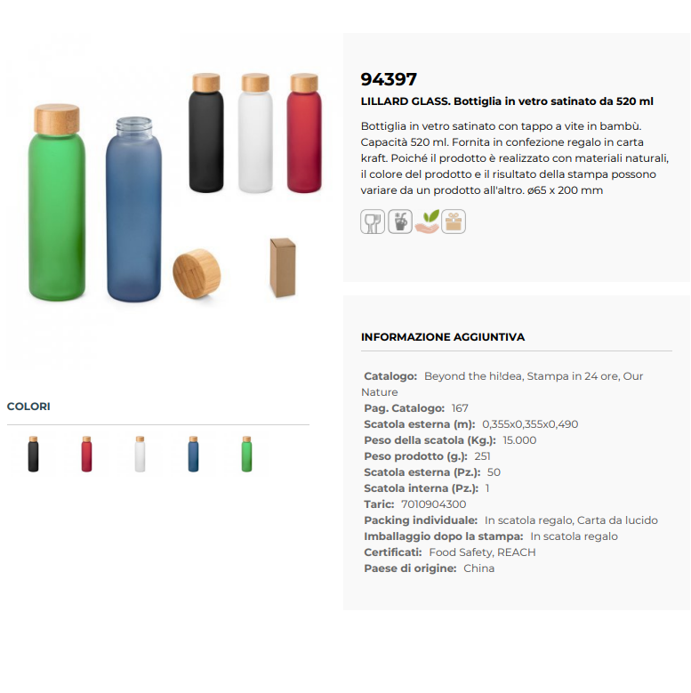 Bottiglia in vetro satinato con tappo a vite in bambù, progettata per una bevanda elegante e naturale. Con una capacità di 520 ml, è ideale per l'uso quotidiano o come regalo ecologico. Il prodotto viene fornito in una pratica confezione regalo in carta kraft. Poiché realizzata con materiali naturali, il colore e la finitura possono variare leggermente, rendendo ogni bottiglia unica. Una scelta perfetta per chi cerca una soluzione sostenibile e raffinata.