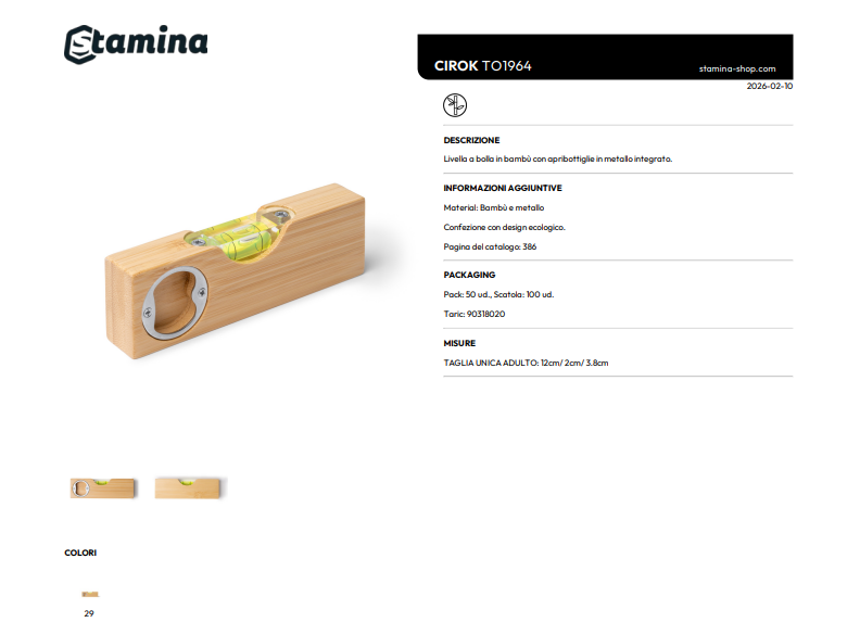 Livella a bolla in bambù con apribottiglie in metallo integrato.