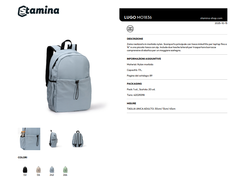 Zaino realizzato in morbido nylon. Scomparto principale con tasca imbottita per laptop fino a 16" e una piccola tasca con zip. Include due tasche laterali per trasportare borracce comprensive di elastico per un maggiore sostegno.