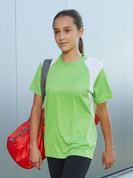 T-shirt bambino maniche corte, tessuto (140 g/m²): 100% poliestere, ad asciugatura rapida, leggera e comoda, dettagli in contrasto, collo rotondo.