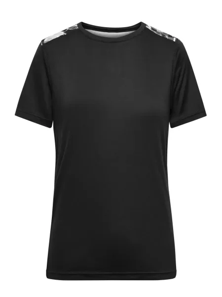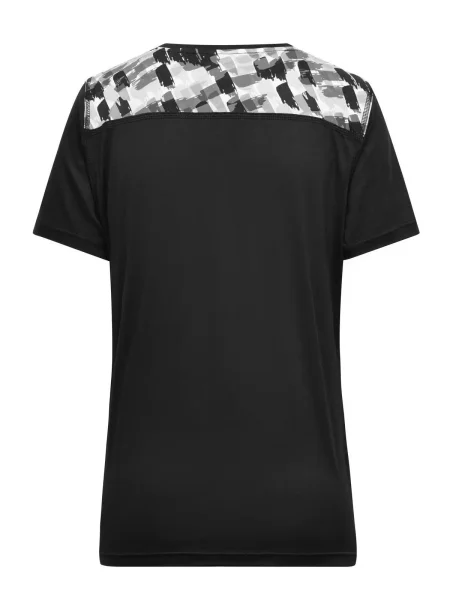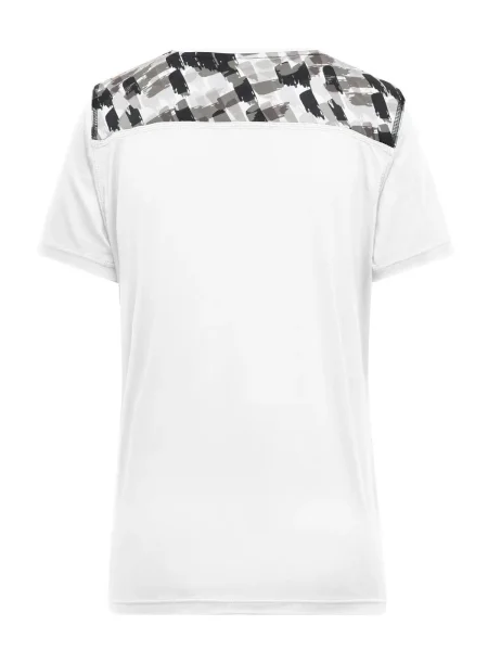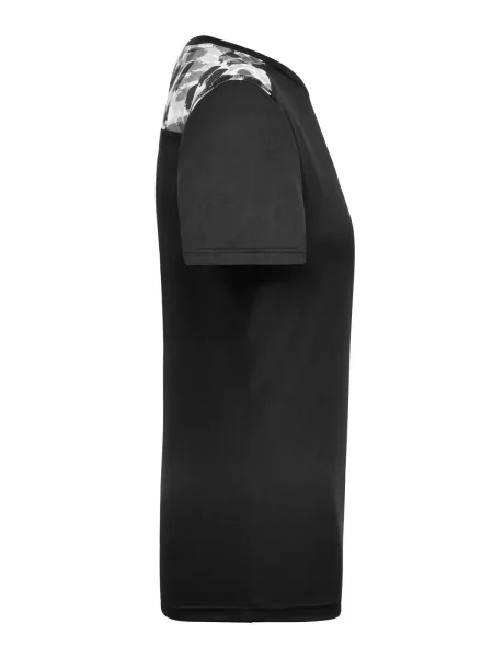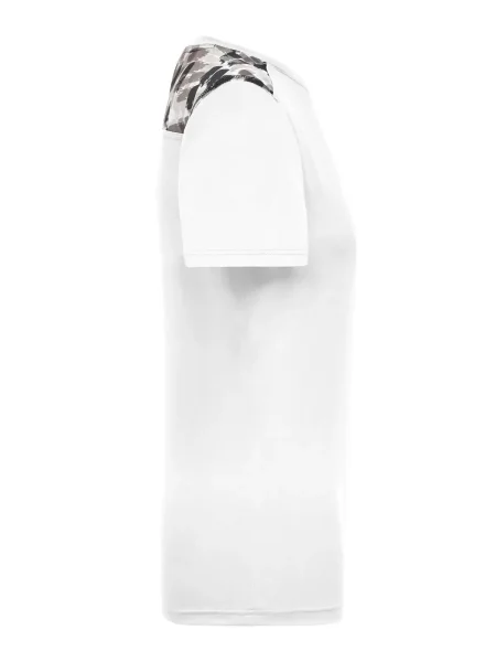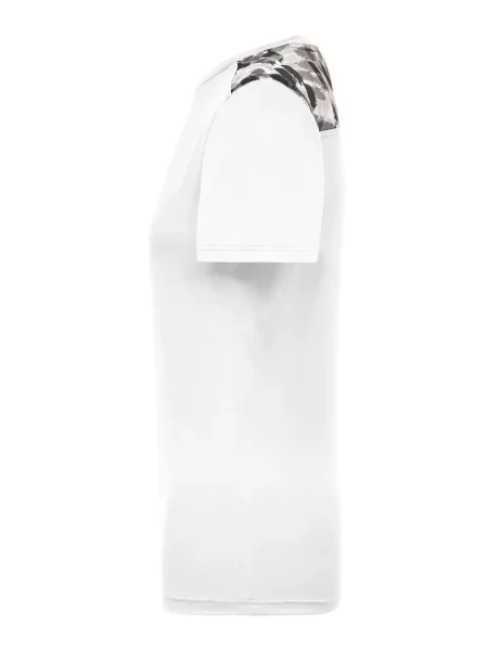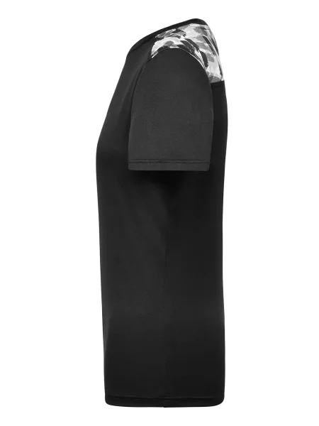 T-shirt sportiva traspirante e con regolazione umidità, asciugatura rapida, leggera e confortevole, maniche raglan, collo rotondo, stampa all-over sulle spalle (fronte e retro), leggermente sfiancata.
