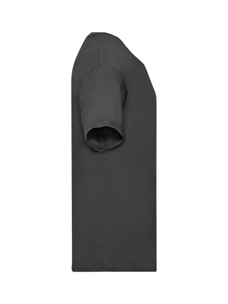 Maglia fine per una migliore stampabilità, scollo a V a costine, fettuccia posteriore nello stesso tessuto, doppie impunture sul bordo delle maniche e sulla base.