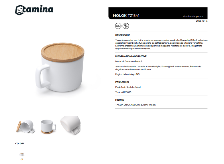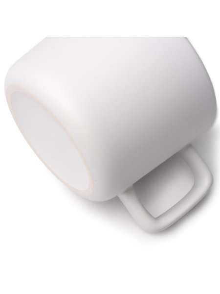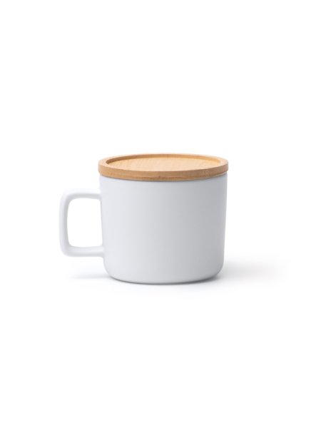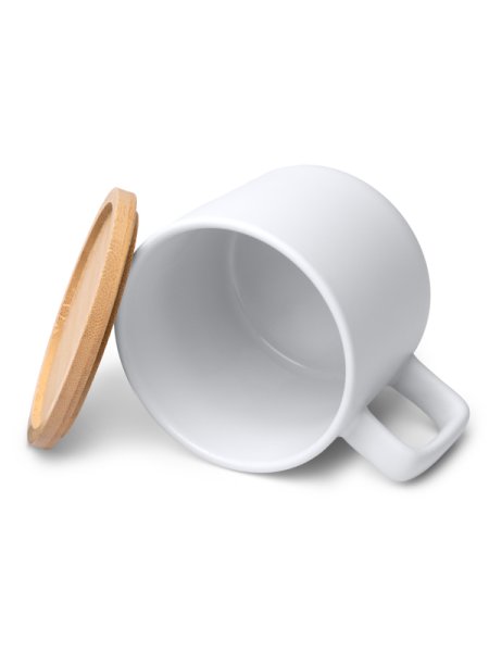Tazza in ceramica con finitura esterna opaca e manico quadrato. Capacità 350 ml, include un coperchio in bambù che funge anche da sottobicchiere, aggiungendo ulteriore versatilità. L'interno presenta una finitura lucida per una maggiore resistenza e durata. Progettata appositamente per la sublimazione. Confezione in cartone kraft.