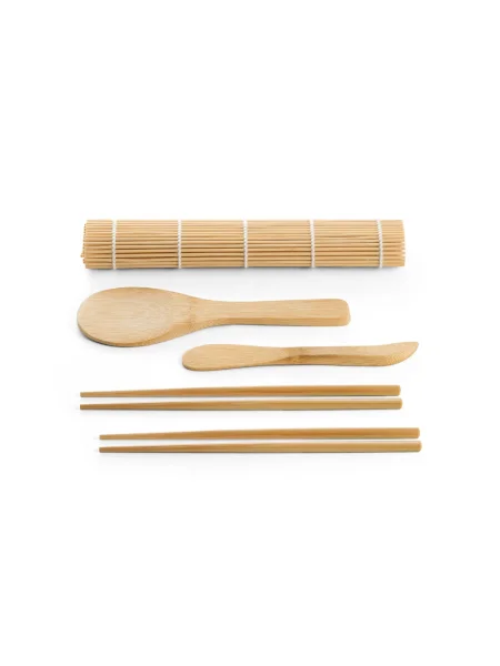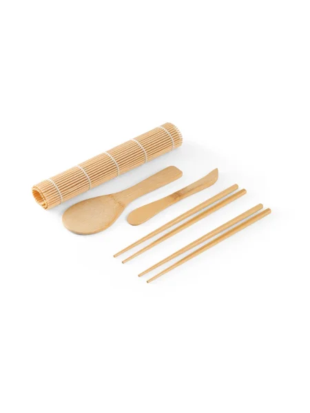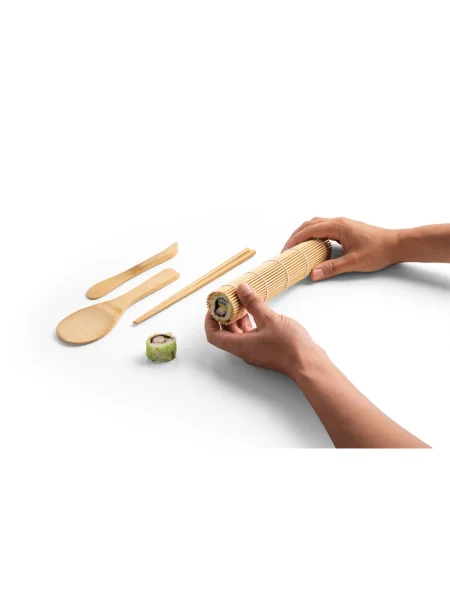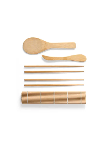 Set per sushi in bambù con tappetino, 2 paia di bacchette, 1 cucchiaio, e 1 coltello. Fornito in confezione regalo di carta kraft. Poiché il prodotto è realizzato con materiali naturali, il colore del prodotto e il risultato della stampa possono variare da un prodotto all'altro. Scatola: 245 x 100 x 33 mm