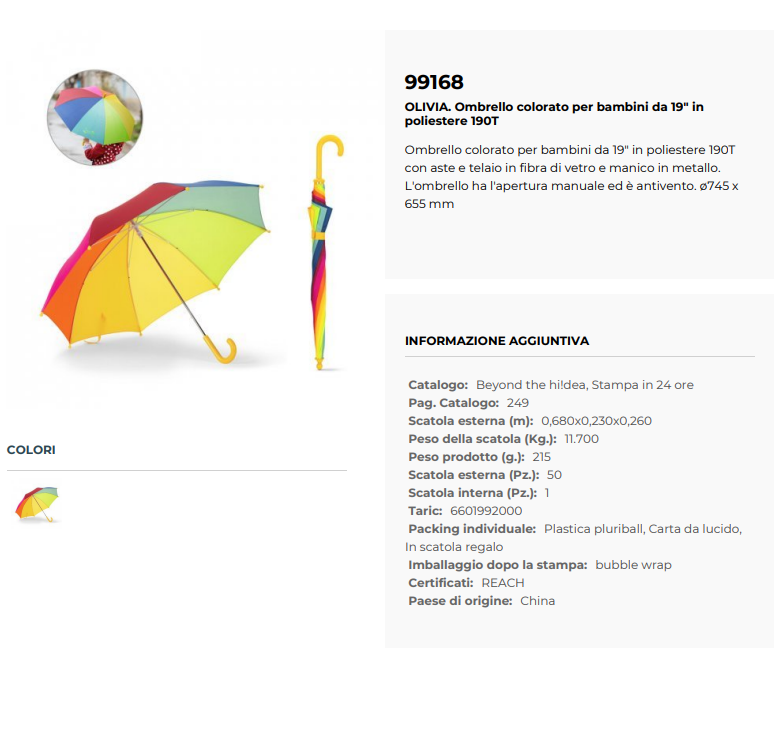 L’ombrello bambini 19 pollici è progettato per offrire protezione e sicurezza nelle giornate di pioggia. Realizzato in poliestere 190T, è dotato di aste e telaio in fibra di vetro che garantiscono resistenza e flessibilità antivento. Il manico in metallo assicura una presa solida, mentre l’apertura manuale lo rende facile da utilizzare anche per i più piccoli. Con dimensioni di ø745 x 655 mm, è leggero, colorato e ideale per accompagnare i bambini nelle attività quotidiane con stile e praticità.