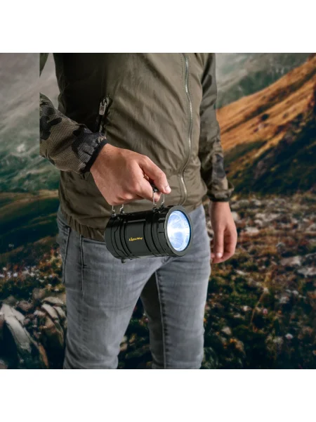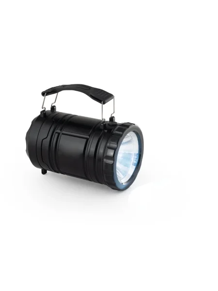 Torcia 2 in 1 in ABS e PS. 2 modalità d'uso: lampada da esterno o da campeggio, che permette di illuminare grandi aree, o come torcia grazie all'impugnatura laterale, anch'essa rimovibile. La torcia è dotata di un LED COB (200 lumen) e di un LED da 1W. Ideale per il campeggio o le attività all'aperto. Include 3 pile AA. Ornito in confezione regalo.