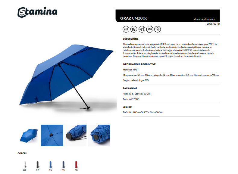 Ombrello pieghevole mini leggero in RPET con apertura manuale e tessuto pongee 190T. Le stecche in fibra di vetro e il fusto centrale in alluminio conferiscono rigidità al telaio e lo rendono antivento. Include protezione dai raggi ultravioletti UPF50 con rivestimento trasparente. Il sistema pieghevole lo rende un ombrello compatto che può essere riposto ovunque. Dispone di un manico nero per il trasporto e di un fodero abbinato.