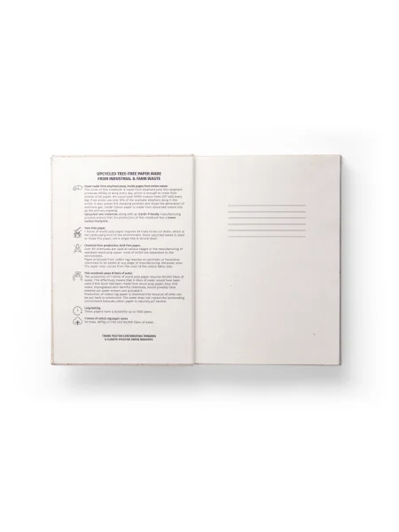 Block notes A5 con copertina rigida fabbricata tramite la materia organica degli elefanti (80%) ed scarti di cotone (20%). La carta interna é fatta con scarti di cotone (100%) ed é altamente resistente. Contiene 120 pagine a righe e fascia in carta stampata. Non sono stati utilizzati prodotti chimici o alberi nel processo di produzione di questo block notes. Poiché il prodotto è realizzato con materiali naturali, il colore del prodotto e il risultato della stampa possono variare da un prodotto all'altro.