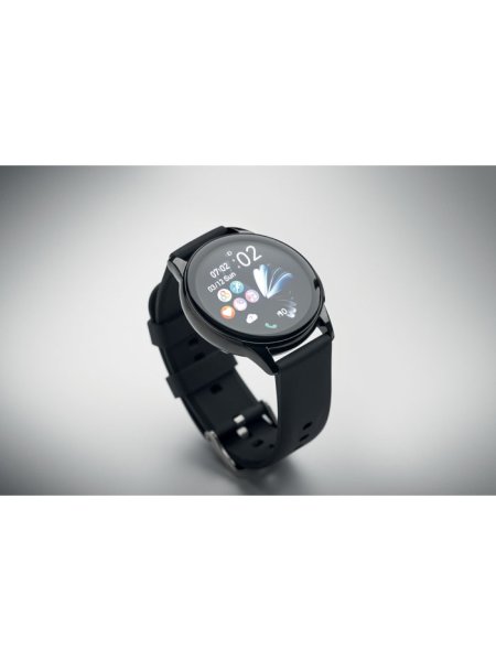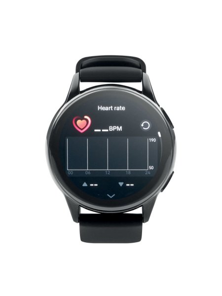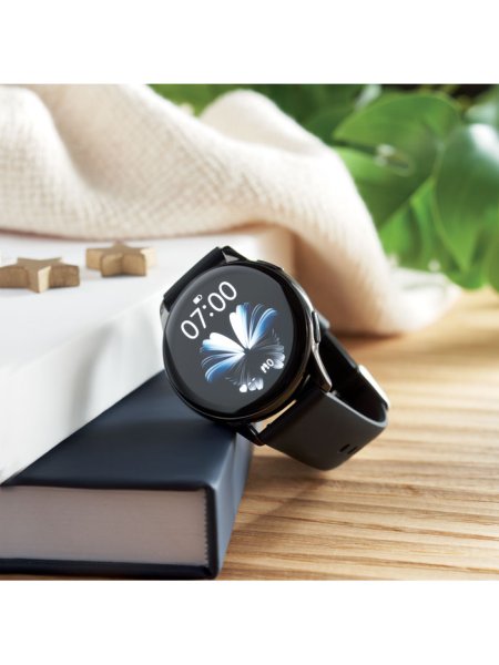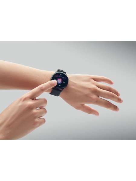 Smartwatch impermeabile IP68 wireless realizzato in lega di zinco con cinturino in silicone morbido. Dotato di schermo touch screen AMOLED da 1,32 pollici e batteria ricaricabile ai polimeri di litio da 300 mAh, funziona tramite l’app gratuita FitCloudPro, disponibile per dispositivi iOS e Android.