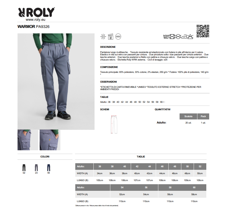 Pantalone lungo multitasche.· Tessuto resistente ed elasticizzato con fodera in pile all'interno per il calore. · Elastico in vita sul retro con passanti per cintura.· Due pinzature sotto i due passanti per cintura anteriori.· Due tasche anteriori.· Due tasche posteriori a filetto con pattina e chiusura velcro.· Due tasche cargo con pattina e chiusura velcro.· Etichetta Roly WRK esterna.· Cicli di lavaggio: x25
