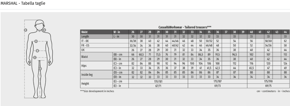 | colori | 27 in (38 IT) | 28 in (40 IT) | 30 in (44 IT) | 32 in (46 IT) | 33 in (48 IT) | 34 in (50 IT) | 35 in (50/52 IT) | 36 in (52 IT) | 38 in (54 IT) | 40 in (56 IT) | 42 in (58/60 IT) |
