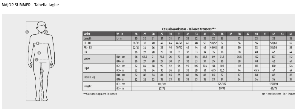 | colori | 27 in (38 IT) | 28 in (40 IT) | 30 in (44 IT) | 32 in (46 IT) | 33 in (48 IT) | 34 in (50 IT) | 35 in (50/52 IT) | 36 in (52 IT) | 38 in (54 IT) | 40 in (56 IT) | 42 in (58/60 IT) |