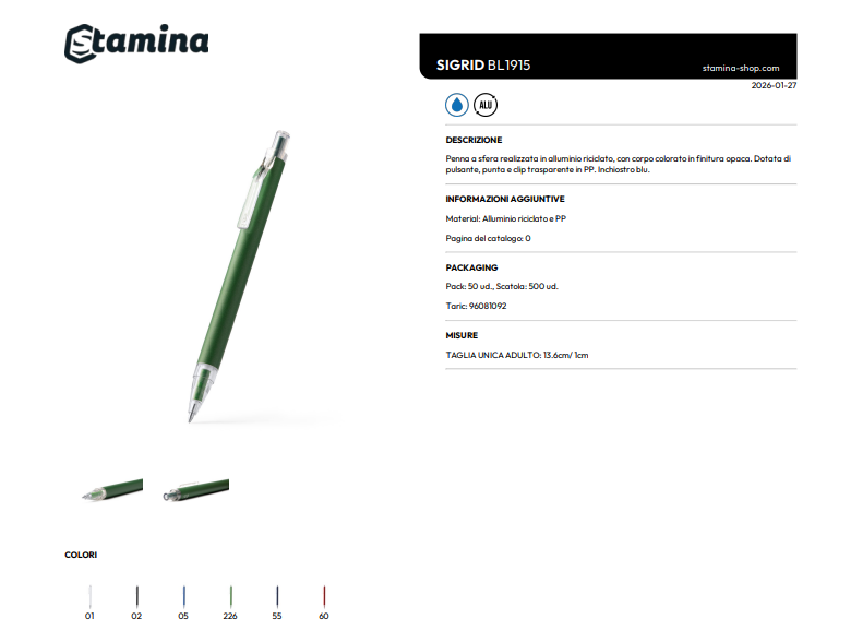 Penna a sfera realizzata in alluminio riciclato, con corpo colorato in finitura opaca. Dotata di pulsante, punta e clip trasparente in PP. Inchiostro blu.