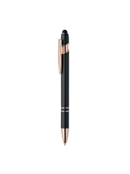Penna a sfera push-stylus in alluminio riciclato con dettagli in oro rosa. Inchiostro blu.