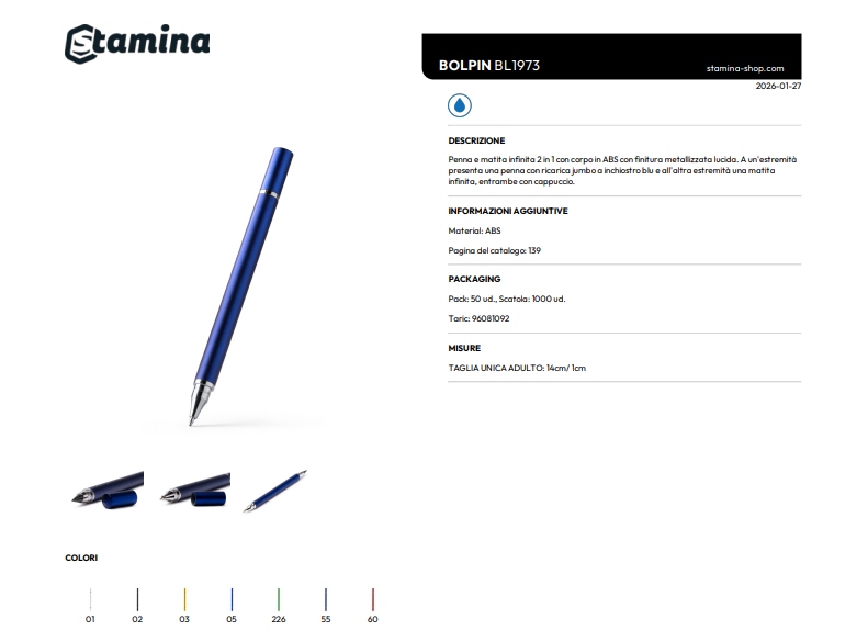 Penna refill blu e matita infinita personalizzabile Bolpin