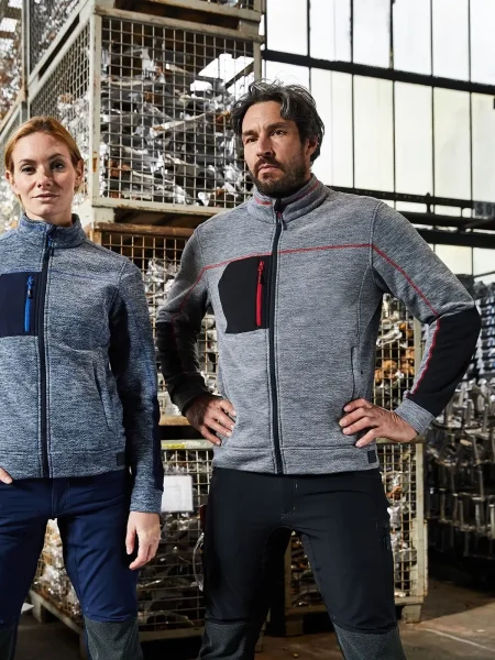 Pile uomo personalizzate mélange easy-care. Caratteristiche del tessuto: morbido e caldo, felpato internamente. Il modello prevede 2 tasche laterali con zip, 2 tasche interne, il taschino sul petto con zip e cuciture a contrasto, il colletto alto, zip frontale con protezione per il mento (zip: YKK).