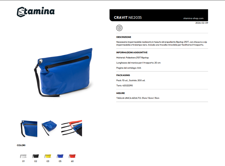 Necessaire impermeabile realizzato in tessuto idrorepellente Ripstop 210T, con chiusura a zip impermeabile e tiralampo nero. Include una tracolla rimovibile per facilitarne il trasporto.