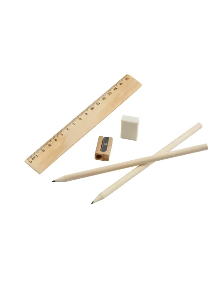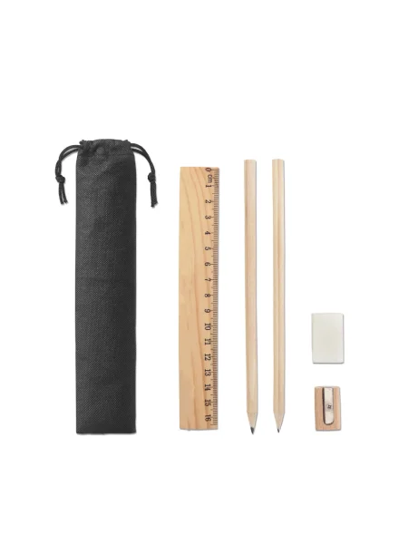 Set da scrittura che include un righello da 16.5 cm, 2 matite in grafite (HB), 1 gomma e 1 temperino. Set fornito in un astuccio in tessuto non tessuto (80 g/m²) con chiusura a coulisse. 60 x 265 mm