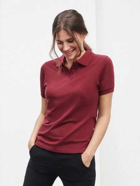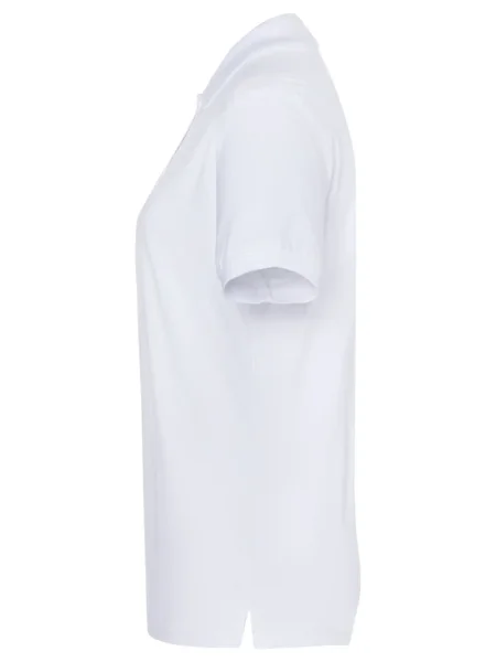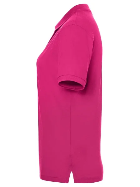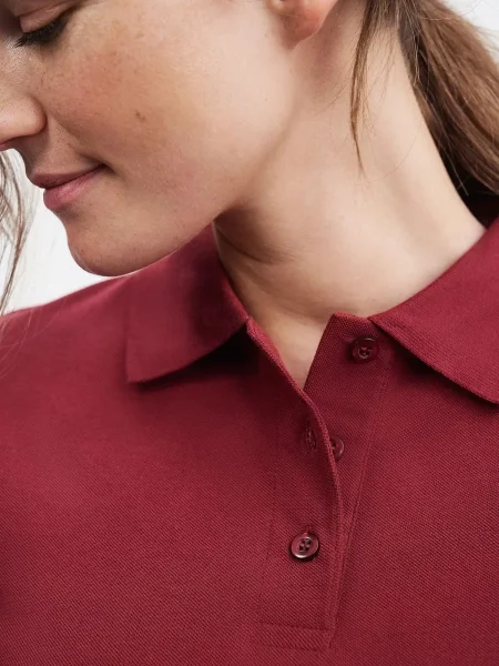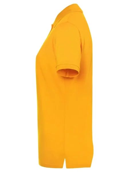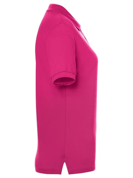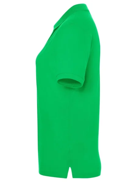 Polo da donna 100% cotone piqué. Polo a maniche corte set-in, taglio sportivo con spacchetti laterali, 3 bottoni tono su tono, doppie cuciture su spalle e giro manica. Struttura con cuciture laterali.