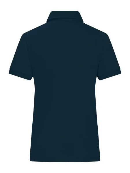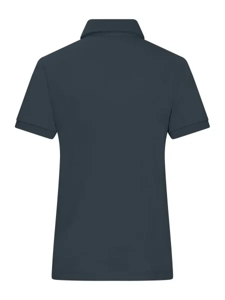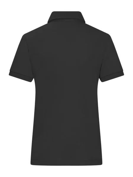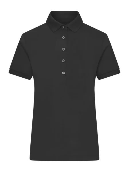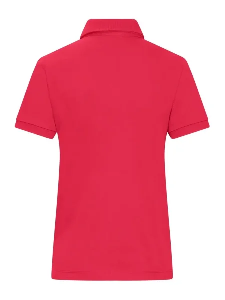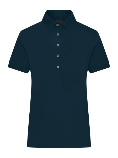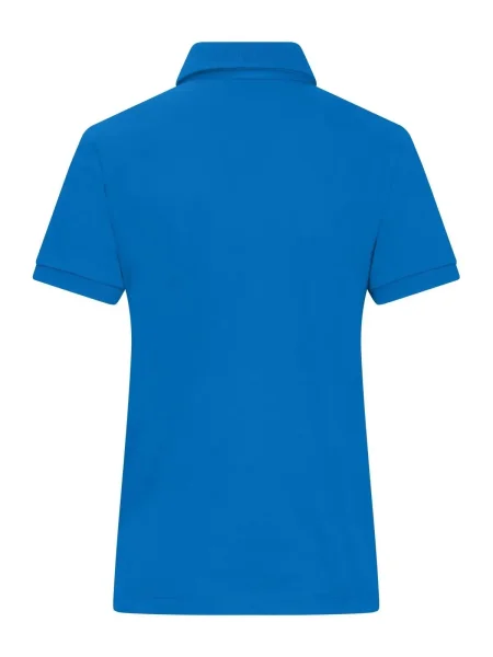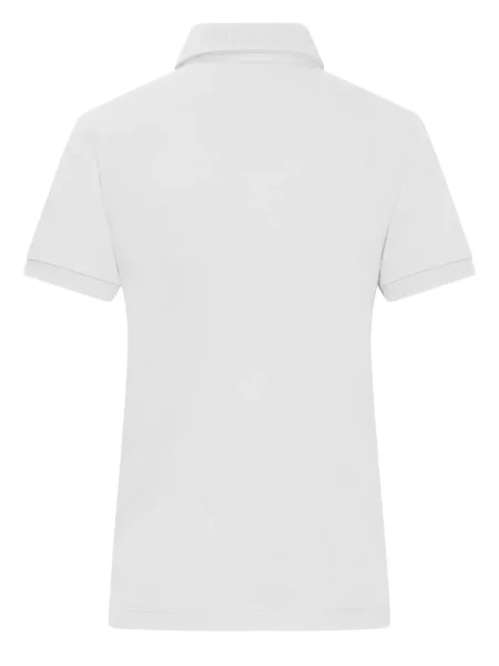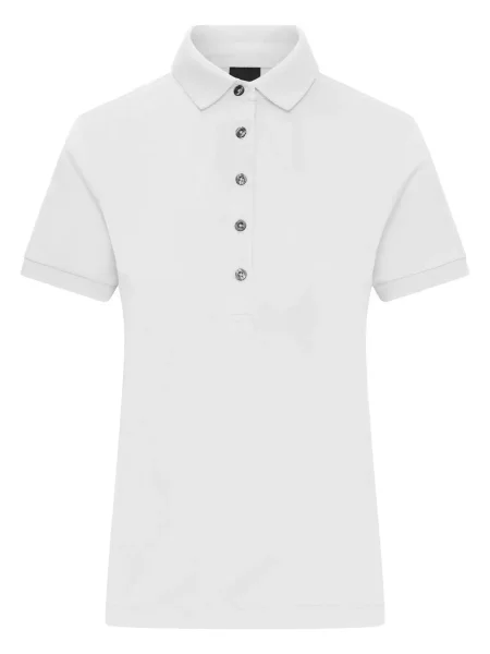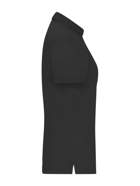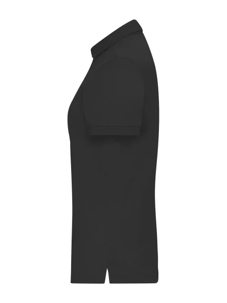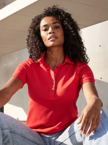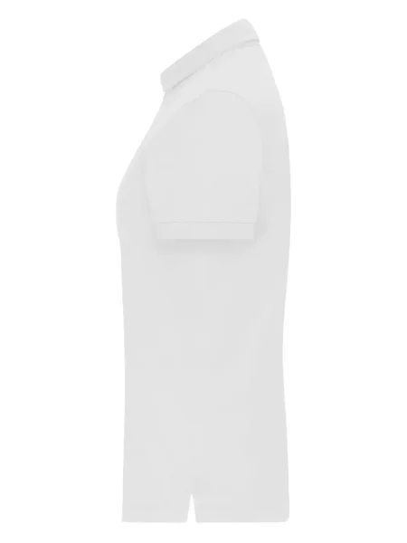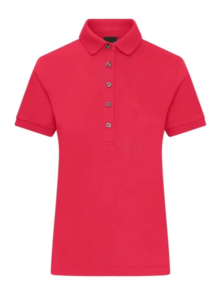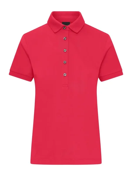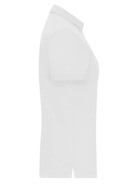 Polo personalizzate online da donna in pregiato jersey singolo di alta qualità in cotone mercerizzato, pettinato ring-spun. Dettagli: colletto e polsini in maglia, spacchetti laterali, 5 bottoni color titanio per tutti i colori, sciancrata. Ordinabile anche neutre.