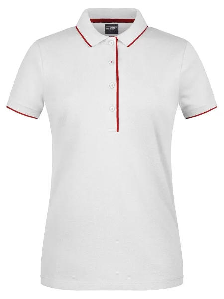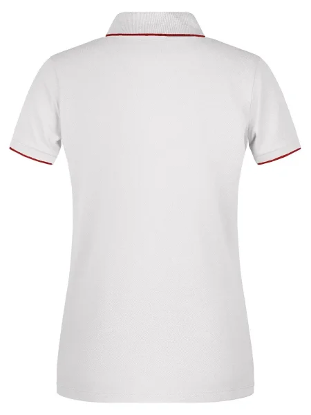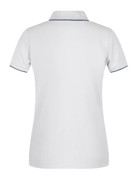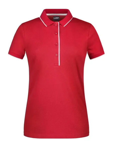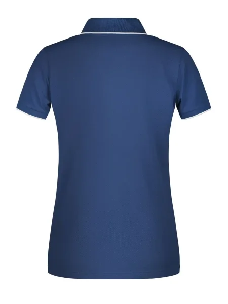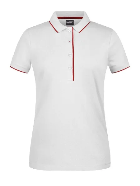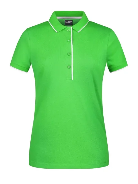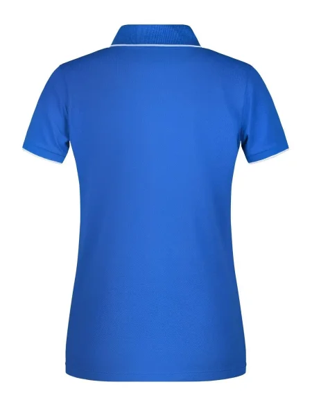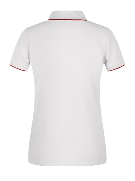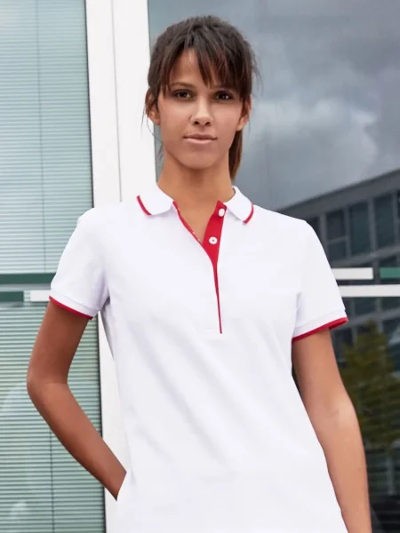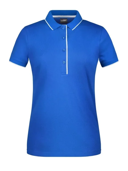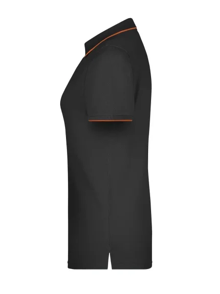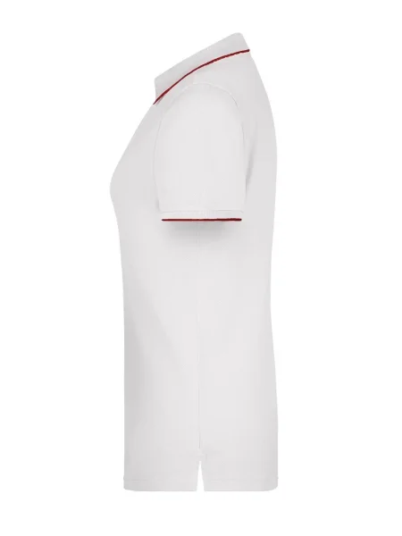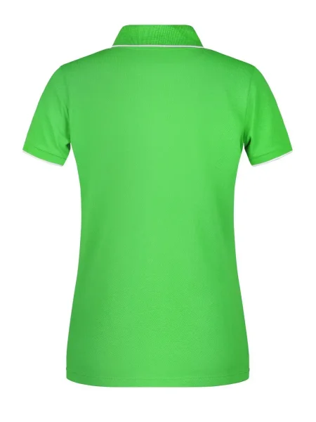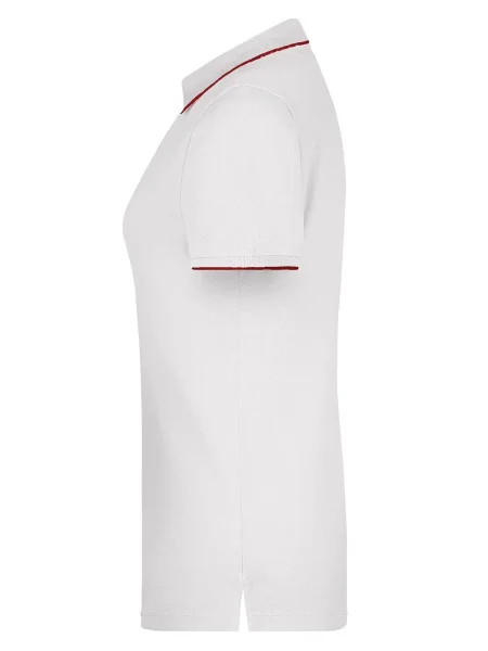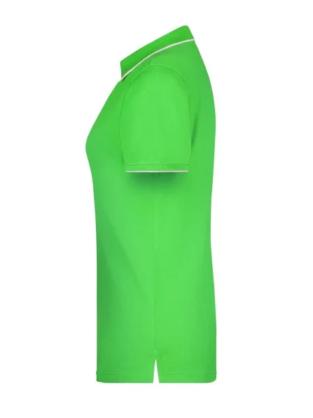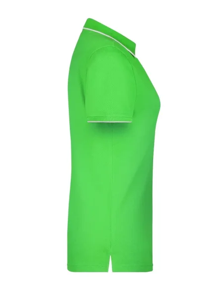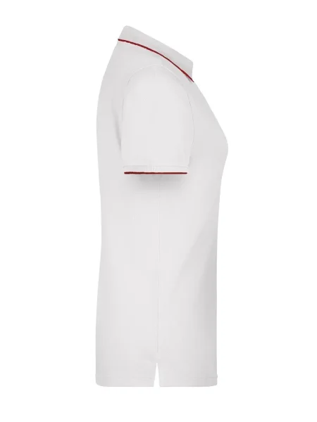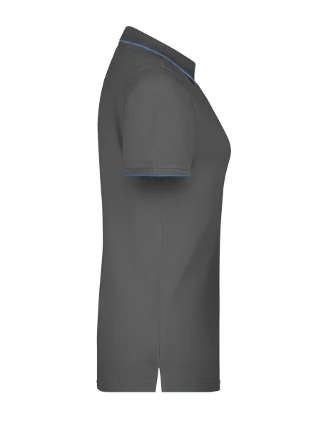Polo da donna con fettuccia nel collo e nelle maniche a costine. La polo ha delle righe a contrasto tono su tono sul collo sui polsini. Sul fianco ci sono gli degli spacchetti laterali. La chiusura del collo della polo ha 4 bottoni. Questa polo può essere personalizzata con logo aziendale.