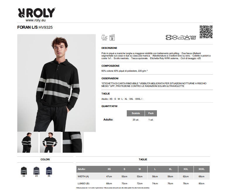 Polo in piqué a maniche lunghe a maggiore visibilità con trattamento anti-pilling.· Due fasce riflettenti segmentate sul corpo e due su ciascuna manica.· Abbottonatura a 3 bottoni tono su tono.· Colletto e polsini a coste 1x1.· Scollo nastrato.· Tasca opzionale.· Etichetta Roly WRK esterna.· Cicli di lavaggio: x25